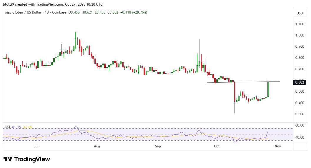 - Magic Eden price soared more than 35% amid a breakout above the key resistance of $0.50.