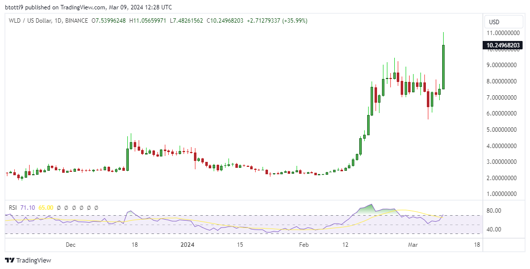 - Worldcoin (WLD) price jumped to a new all-time high of $10.92 on March 9.
